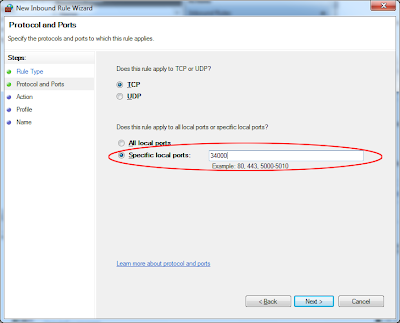 - Click on TCP. Type "34000" into the "Specific local ports" text field, unless you're using an alternate port number in your iSyncr Desktop settings. If so, enter that port number. Click Next.