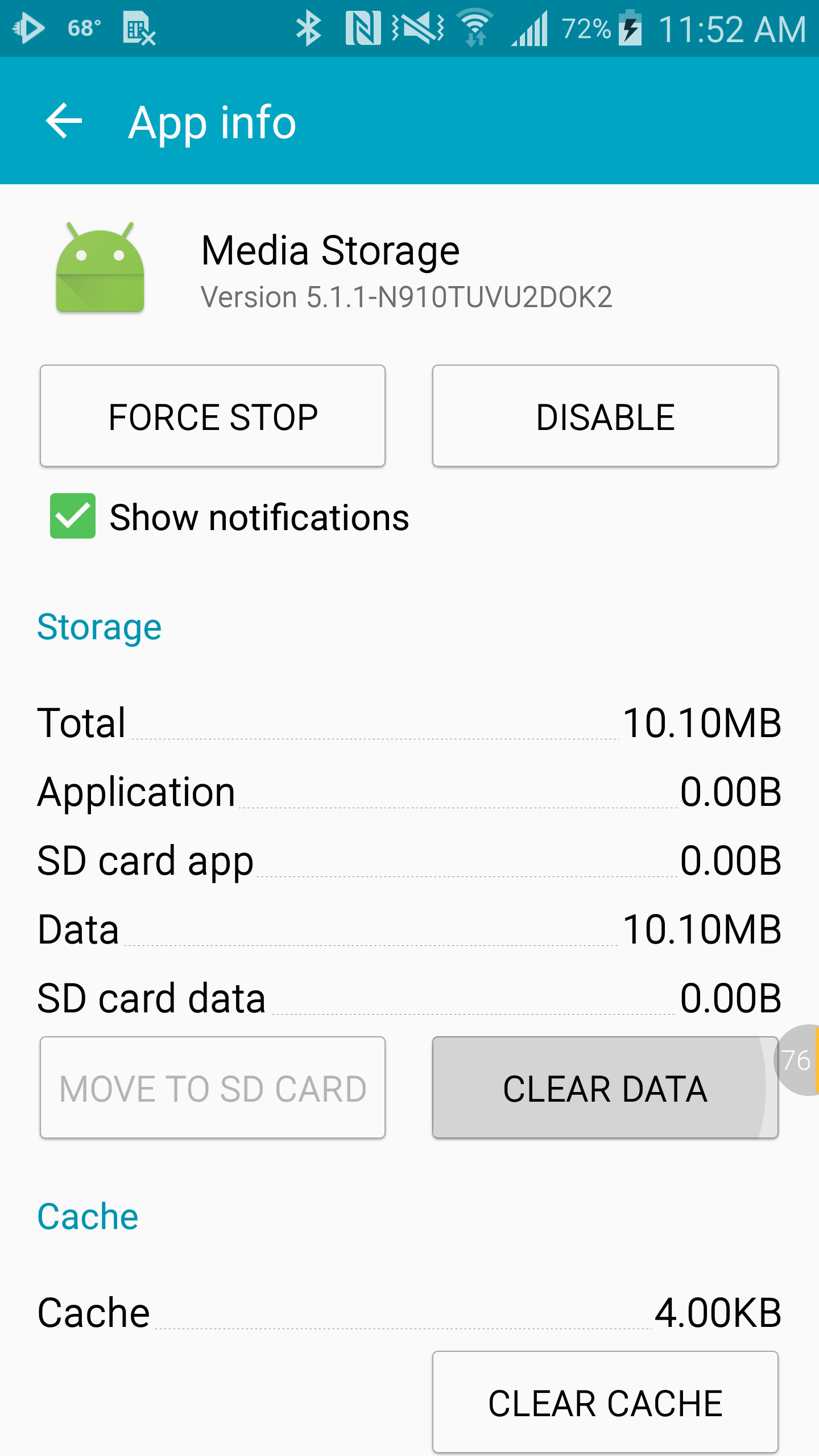 - Select “Media Storage” sometimes called “Media Store” or other variation; press “Clear data”.