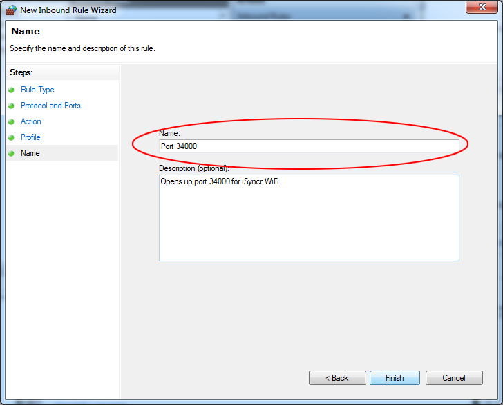 - Type "Port 34000" into the "Name" text field. Click Finish. You're done!