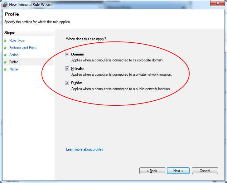 - Ensure that "Domain", "Private", and "Public" are all checked. Click Next.