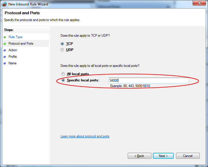 - Click on TCP. Type "34000" into the "Specific local ports" text field, unless you're using an alternate port number in your iSyncr Desktop settings. If so, enter that port number. Click Next.